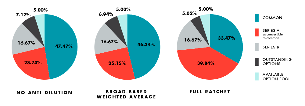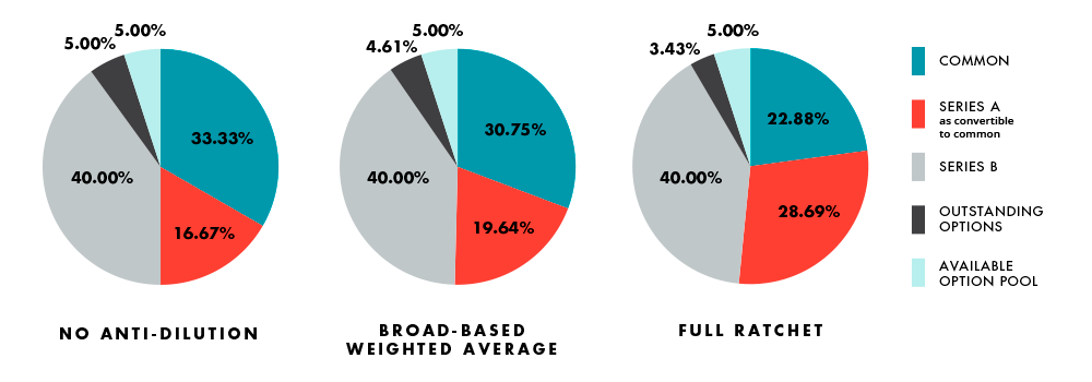 Below are a couple of examples that demonstrate the effect of full ratchet and broad-based weighted-average anti-dilution protection. Notice how the percentage ownership of the Series B and Available Option Pool remains fixed, while the Series A increases at the expense of the common and outstanding options. Also note how much more significant the Series A adjustment is in Example 2