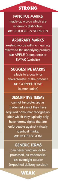 Not all terms can be trademarks, and not all trademarks are created equal. The inherent strength of a trademark (as opposed to commercial strength that must be cultivated through sales, marketing, and word-of-mouth) is determined by where on the “spectrum of distinctives” the mark falls. At one end of the spectrum are fanciful marks—made-up terms that are entitled to the broadest protection; at the other end of the spectrum are generic terms, which are just words for categories of products or services, and for which no business can claim exclusive rights.
